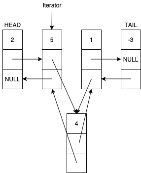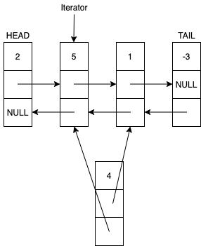 2. 4라는 값을 갖는 새로운 노드 생성 후 Iterator가 가르키는 노드와 그 다음 노드를 포인터로 지정한다.