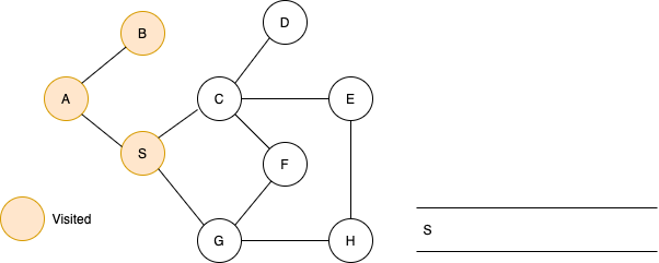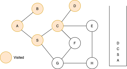 visited된적 없으면 Stack에 해당 원소를push()하고visited로 상태를 바꾼다. 만약 최상단의 원소와 연결되어 있는 모든 원소가visited면 Stack에서pop()한다.위 그래프에서 A를 먼저 Stack에 넣고 시작하면 다음과 같은 과정을 따른다.